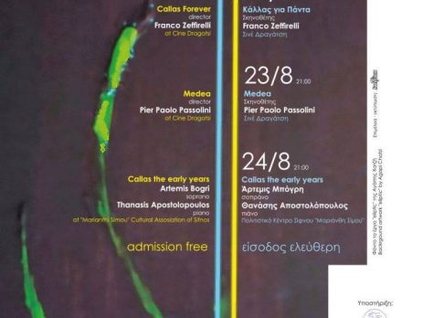 Αφιέρωμα στη Μαρία Κάλλας – 40 χρόνια από το θάνατό της 22.8.2017, ώρα 21:00, Σινέ Δραγάτση: ΚΑΛΛΑΣ ΓΙΑ ΠΑΝΤΑ, Σκηνοθέτης: Franco Zeffirelli 23.8.2017, ώρα 21:00, Σινέ Δραγάτση: MEDEA, Σκηνοθέτης: Pier Paolo Passolini 24.8.2017, ώρα 21:00, Πολιτιστικό Κέντρο Σίφνου “Μαριάνθη Σίμου” CALLAS THE EARLY YEARS ΘΑΝΑΣΗΣ ΑΠΟΣΤΟΛΟΠΟΥΛΟΣ: πιάνο – ΑΡΤΕΜΙΣ ΜΠΟΓΡΗ: σοπράνο Είσοδος ελεύθερη